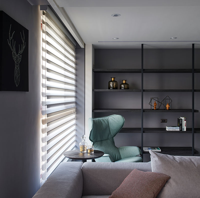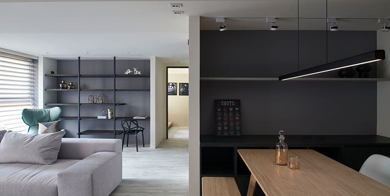 We adopt a low Chroma blackish-gray base tone and complement clean patterns and lines to definite each functional area, skillfully manifesting an understated, concise modern style, also favorable to arrange featured furnishings to show the unique character. Besides, we opt for homeowner's favored sheer blinds that can adjust brightness according to the mood and correspond to the plain interior design.