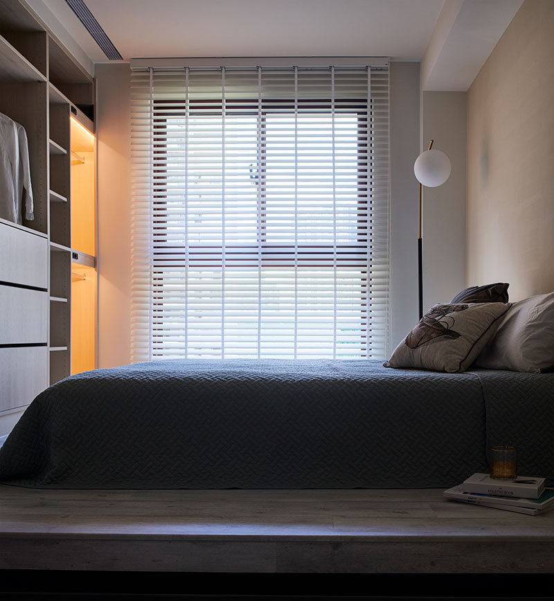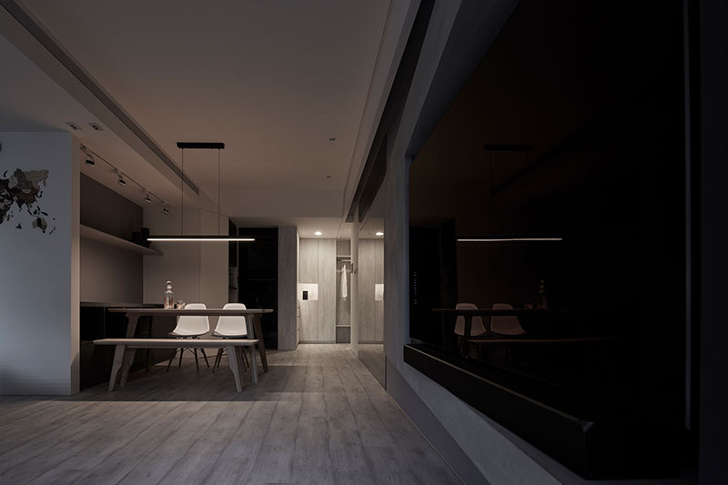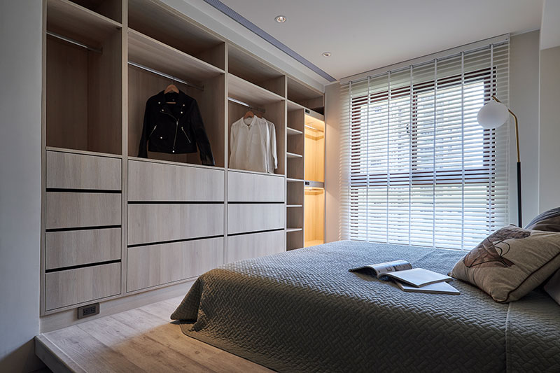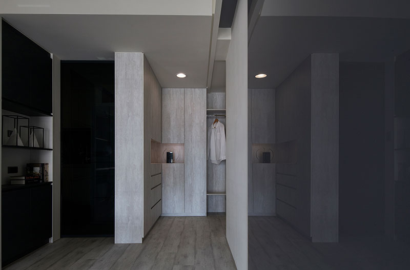 Since there's a young kid in the family, we basically set up storage cabinets without handles. And mount a dark gray magnetic baking glass on the entryway and dining area wall, which can serve as a dressing mirror, a message board, and a kid's graffiti area. Moreover, we elevate the master bedroom's floor to shape a broad sleeping area for the whole family and favorable for the parents to take care of their young child. We also set up a secondary bedroom for the kid to utilize in the future.