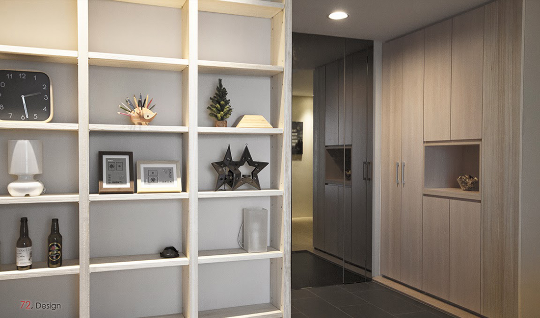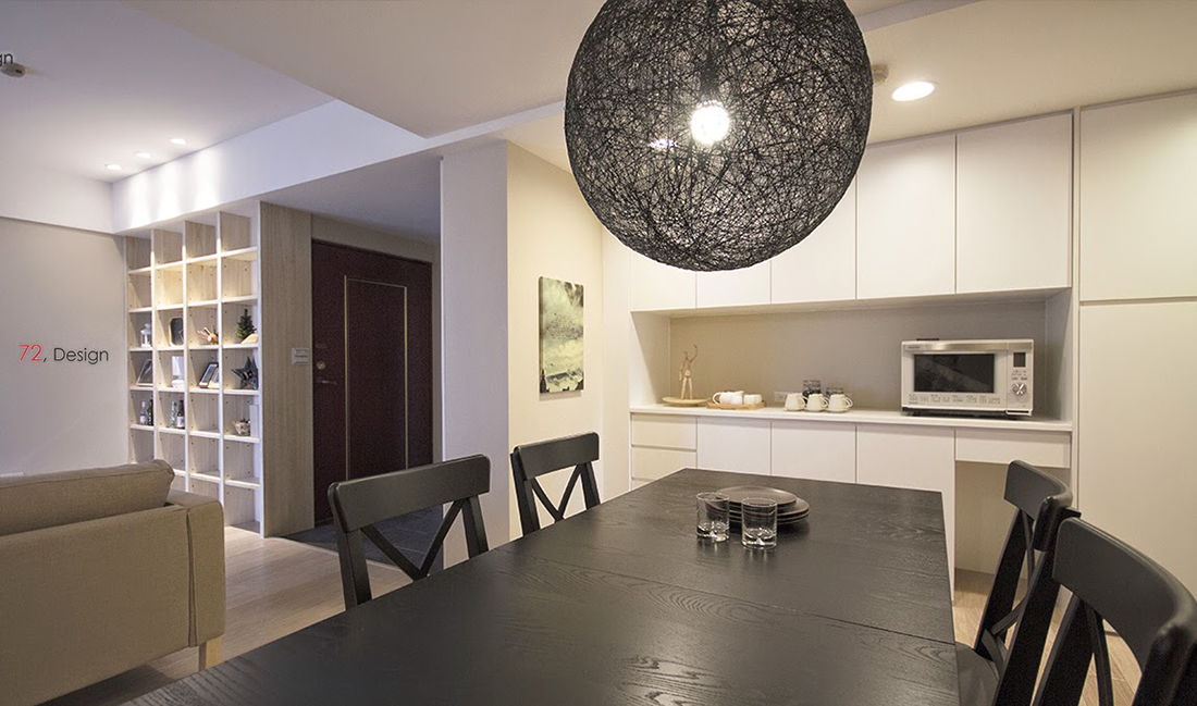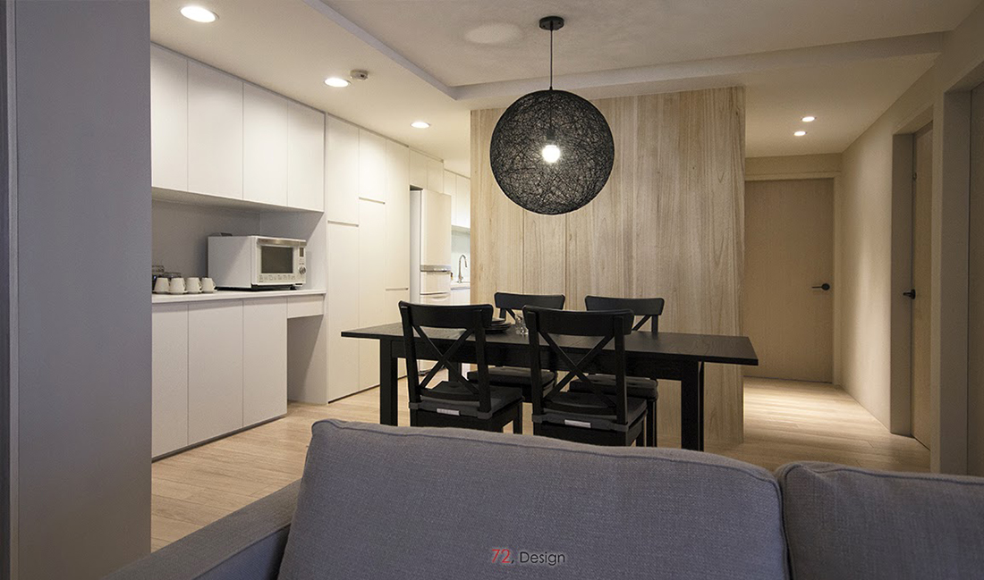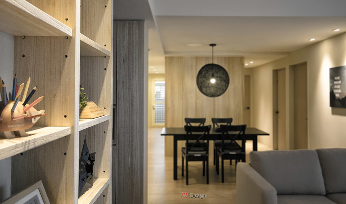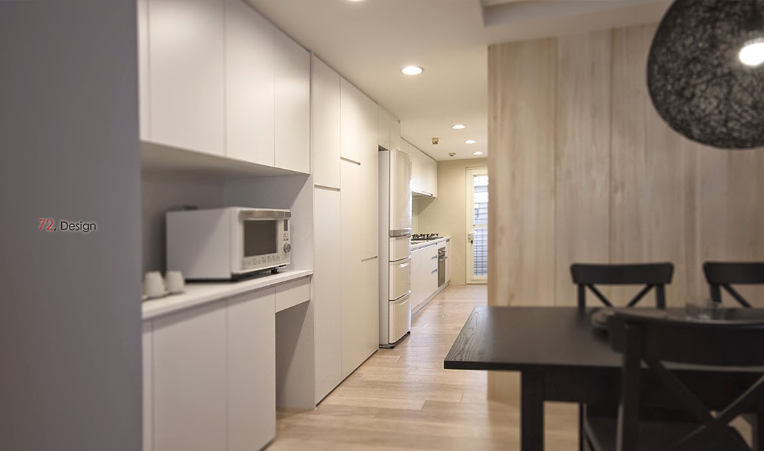 除此之外我們也移除了廚房與餐廳的隔間,讓原本狹窄的廚房,透過一整排廚具與餐櫃的連貫,把廚房與餐廳整個連結在一起. 雖然目前是採用開放式廚房的設計,但其實在規劃階段我們也曾考慮過將拉門隱藏在餐桌後方的木飾牆後,讓有必要時可以透過拉門來封閉廚房油煙. 而房間外的廊道部分,在設計上則是盡可能避免曲折迂迴的陰暗走廊,盡可能朝短潔明亮的方向發展.