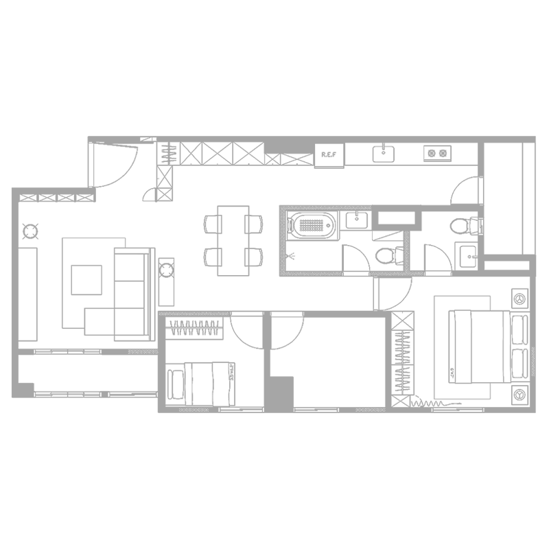 在原始的格局當中,從大門一進入家裡最先映入眼簾的會是餐廳區域. 因此在設計時順勢透過一個小玄關的規劃,把入口轉往了客廳方向,同時客廳的大落地窗也提供了入門第一眼的明亮印象. 其次的格局改變是壓縮了客房的空間,讓預計使用率不高的客房回歸到合理的大小格局,同時讓餐廳有了舒適的大小、廊道也變得更加順暢明亮.