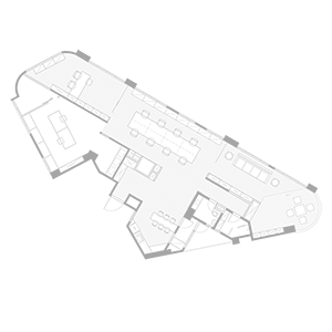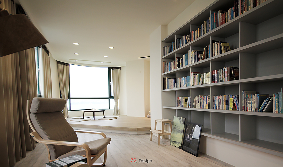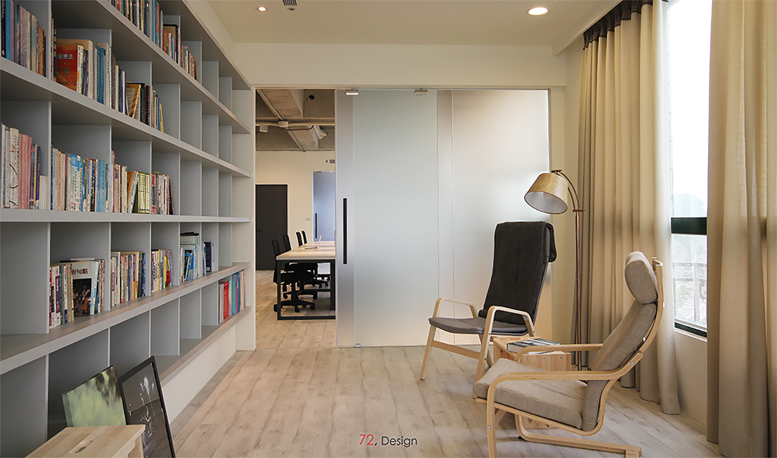 雖然我們不是第一次進行辦公室設計, 也知道辦公室都有基本的休憩空間, 讓職員有著適度的放鬆才能換來更大的工作效益, 但在經過討論後, 我們配置了鮮少有機會規劃的, 不比辦公區域小的大型休息空間, 人員可以在此靠著躺椅閱讀, 或是席地聊天, 也可以在架高地板區泡壺茶, 觀賞美輪美奐的淡水河景. 在較為正式的時間場合時, 休息室也可以轉變為高級會客室, 用來接待正式賓客, 同時此處也備有電子投影布幕, 即使要進行簡報提案也都有著充足機能.