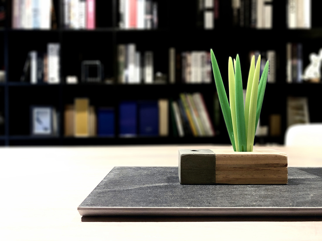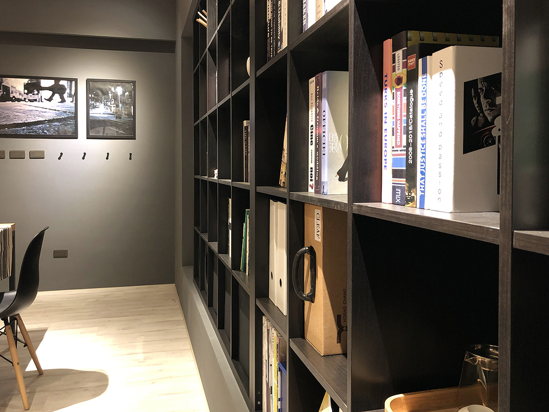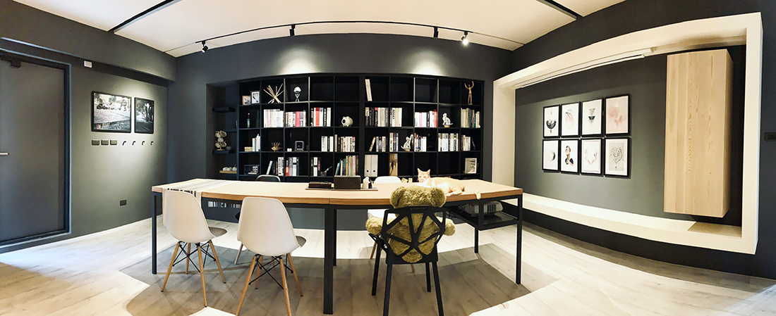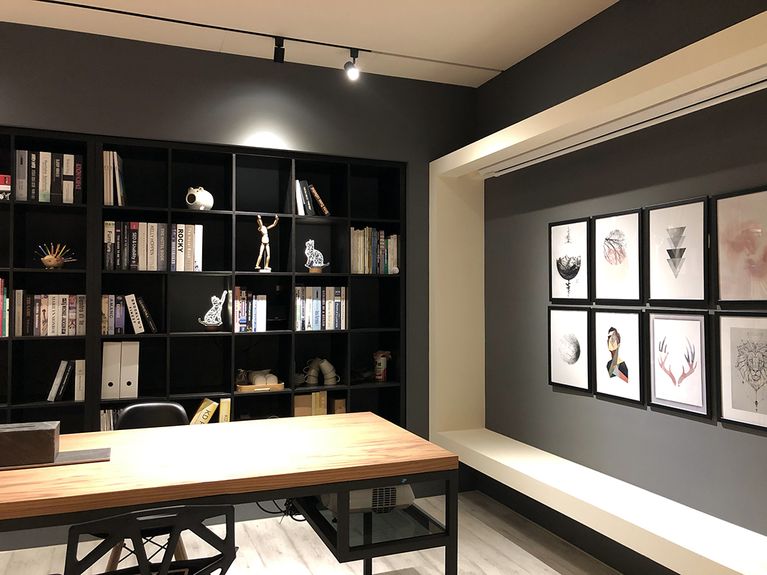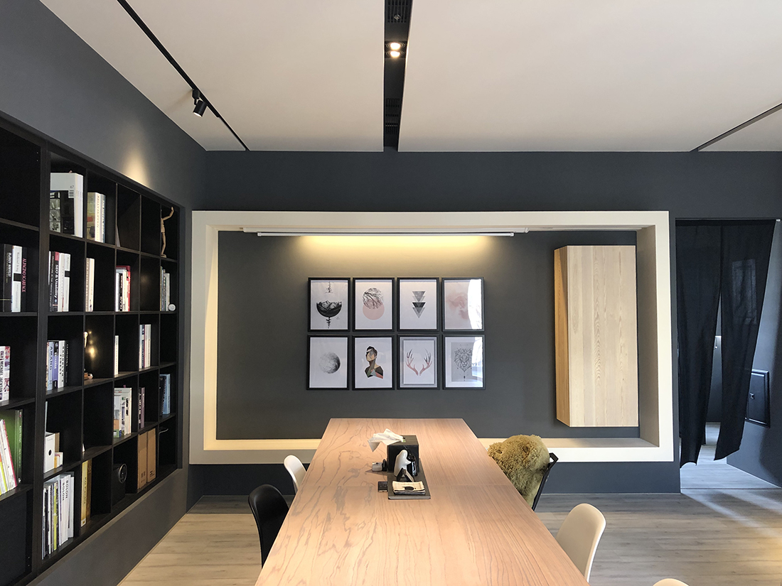 進到室內來當然就是我們的會客空間。是會議室,也是接待室,如果把中間的會議桌換成餐桌加沙發,它也可以是一個很舒適的客餐廳空間。其中的簡報用螢幕(你也可以想成家中的客廳電視)採用的是投影機形式,這有幾個很大的好處,其中之一是不需要被固定擺放的電視給佔用一整面牆,透過捲動式的投影布幕,我們可以把原本擺放電視的牆面拿來做更有效的運用,也許是櫃子,也許是展示架,或是像我們一樣放上幾幅好看的畫作。