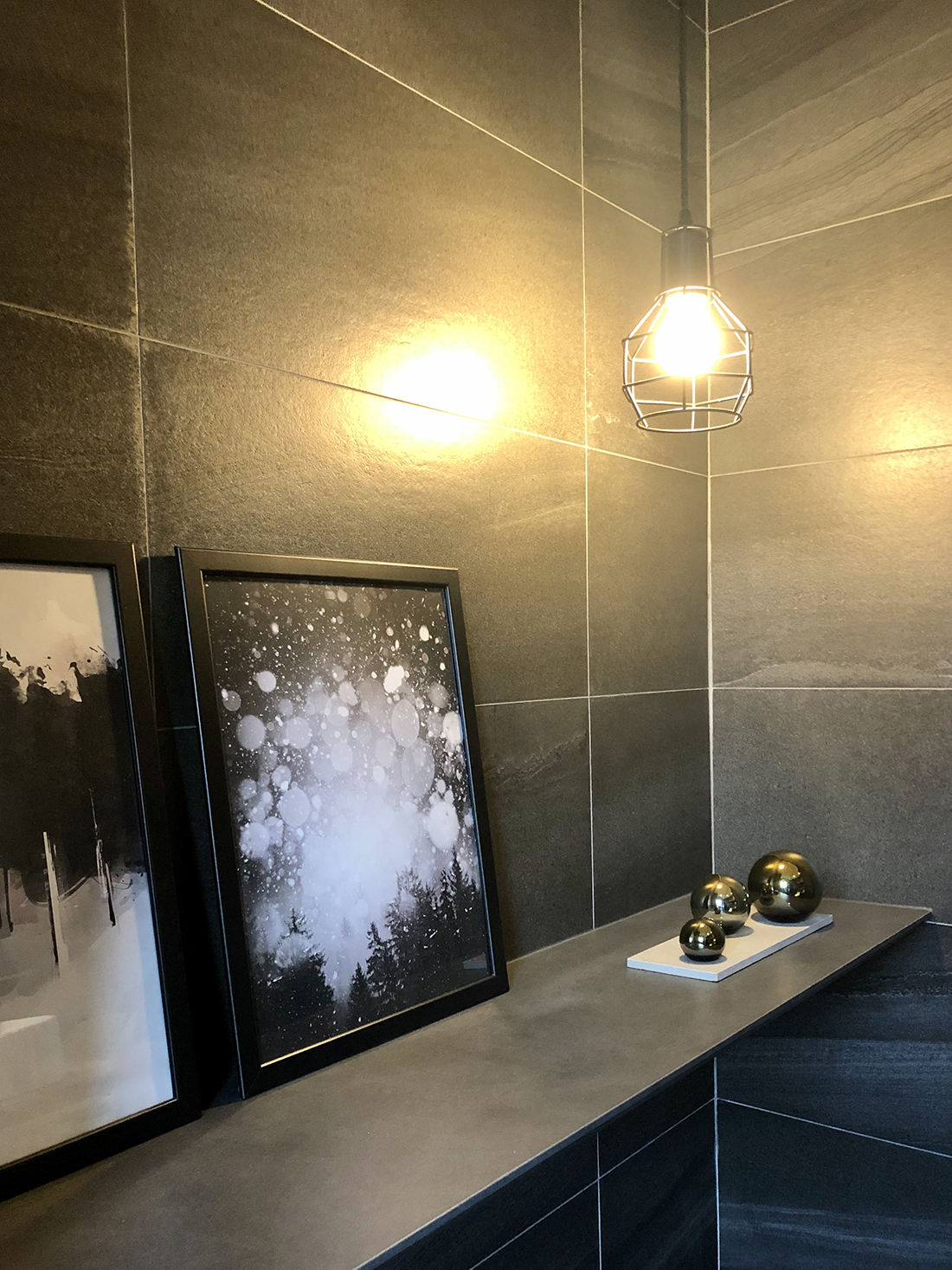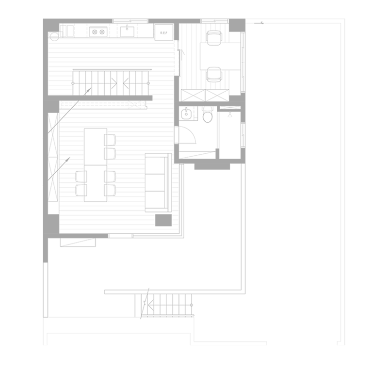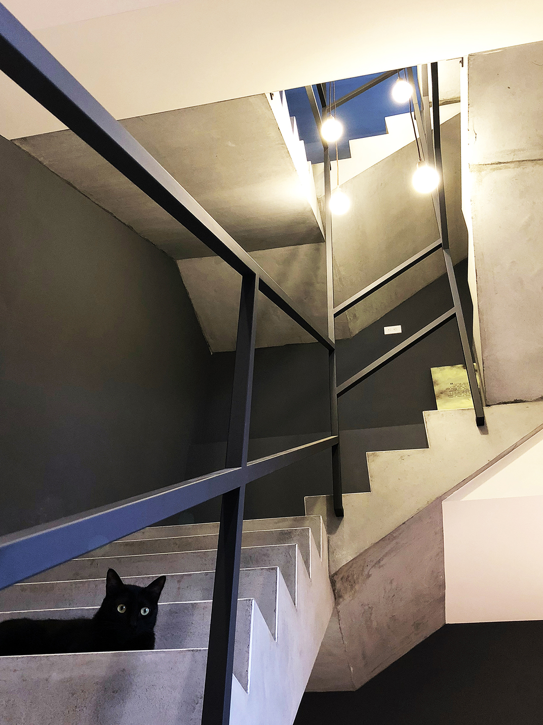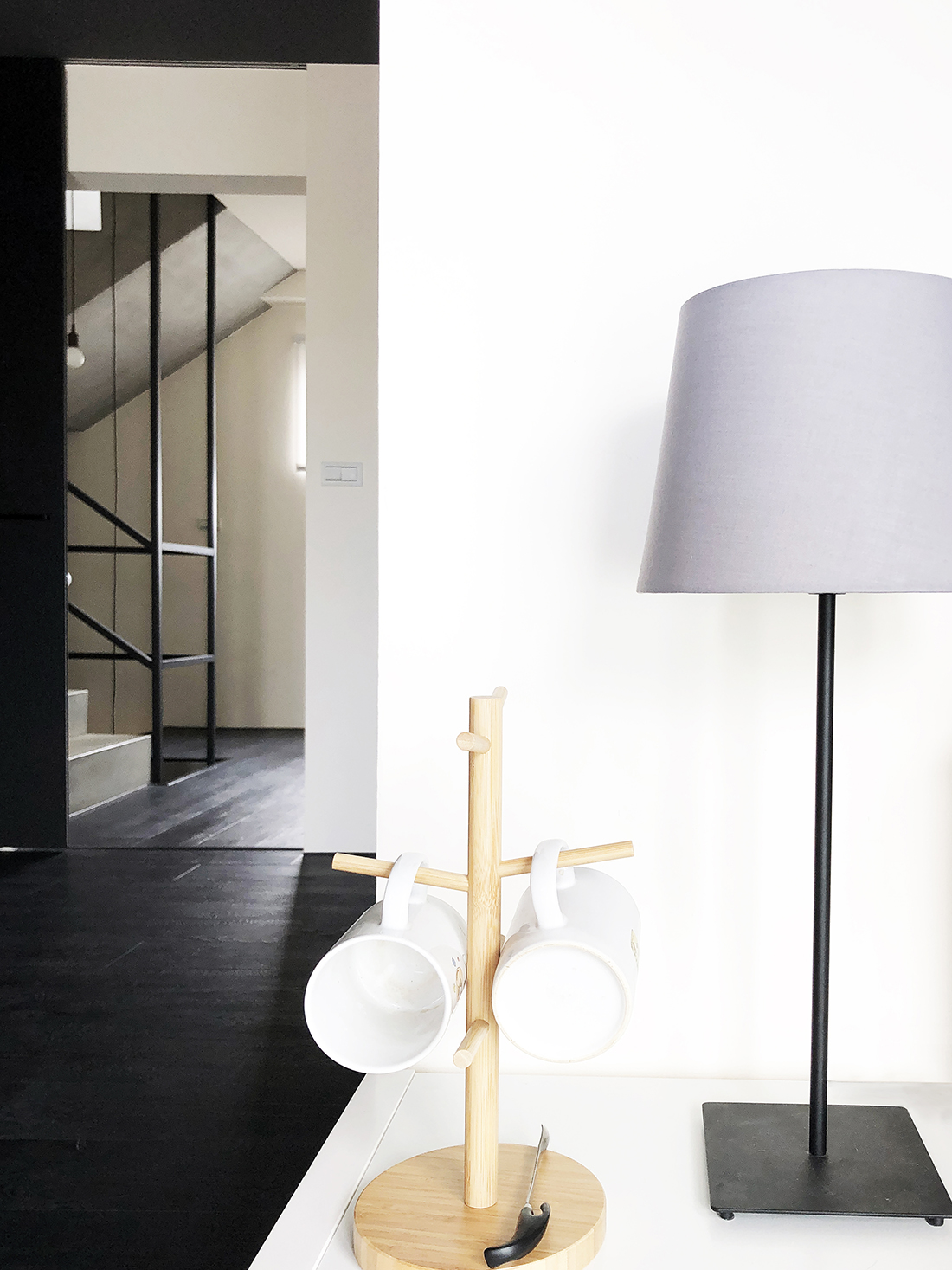 進到室內來當然就是我們的會客空間。是會議室,也是接待室,如果把中間的會議桌換成餐桌加沙發,它也可以是一個很舒適的客餐廳空間。其中的簡報用螢幕(你也可以想成家中的客廳電視)採用的是投影機形式,這有幾個很大的好處,其中之一是不需要被固定擺放的電視給佔用一整面牆,透過捲動式的投影布幕,我們可以把原本擺放電視的牆面拿來做更有效的運用,也許是櫃子,也許是展示架,或是像我們一樣放上幾幅好看的畫作。